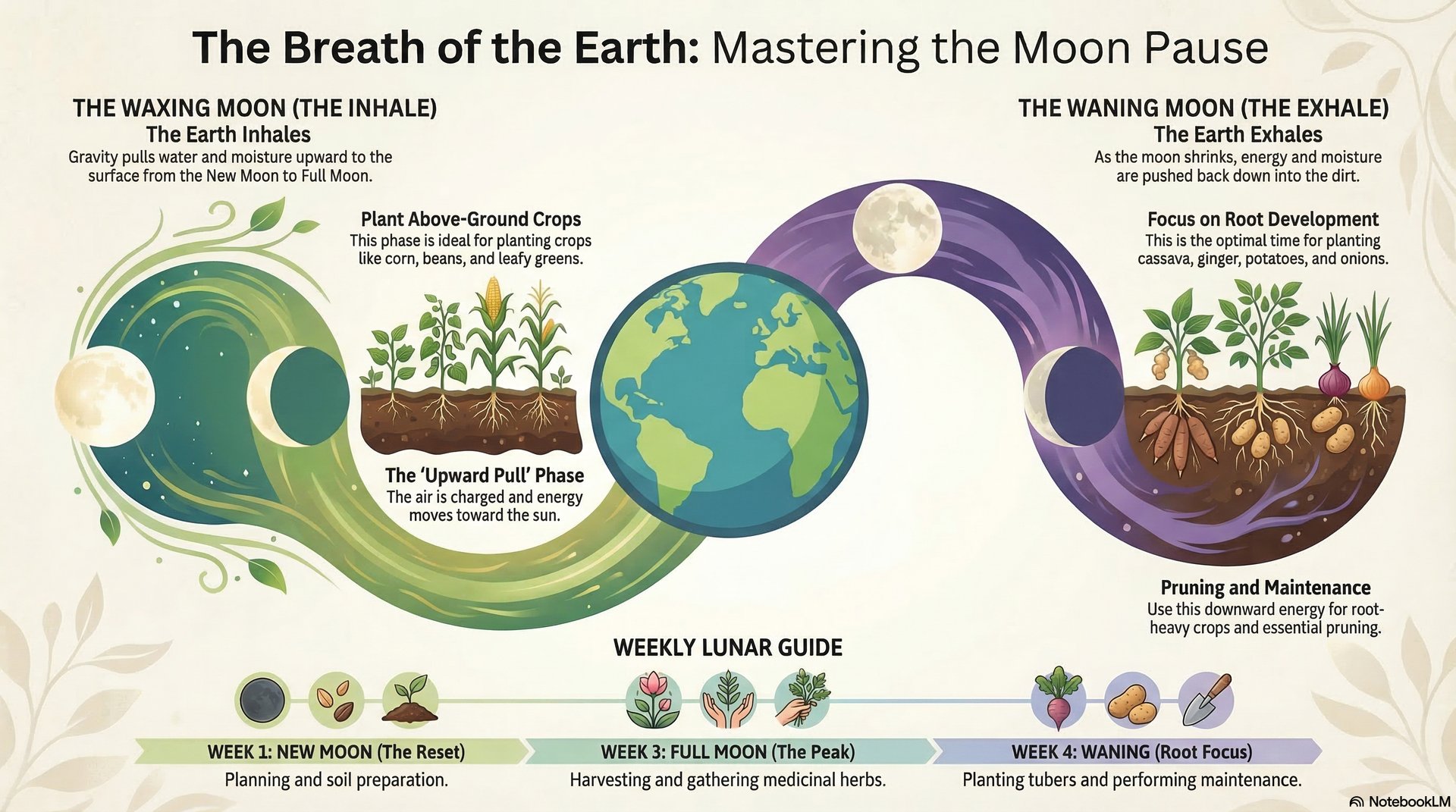The Exhale (Waning Moon): As the light fades, the energy is pushed back down into the dark soil. This is the time for grounding and foundation. Plant your Cassava, Ginger, and Root Crops now.